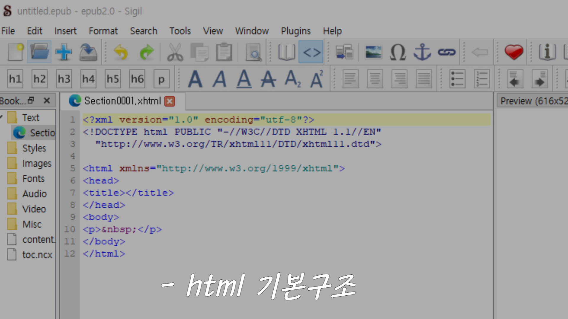 전자책에 쓰이는 HTML 문서는 보통 아래와 같은 기본 형태를 갖습니다.
