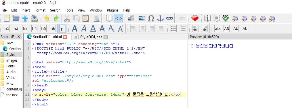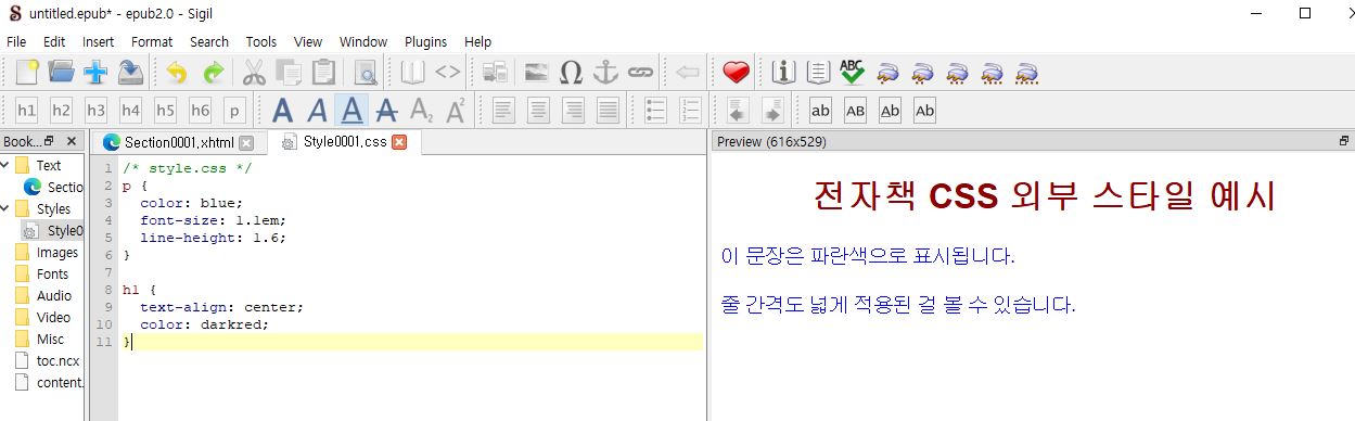 → 이렇게 해야 Sigil의 **미리보기(BookView/PageEdit)**에서 스타일이 정상적으로 보입니다.