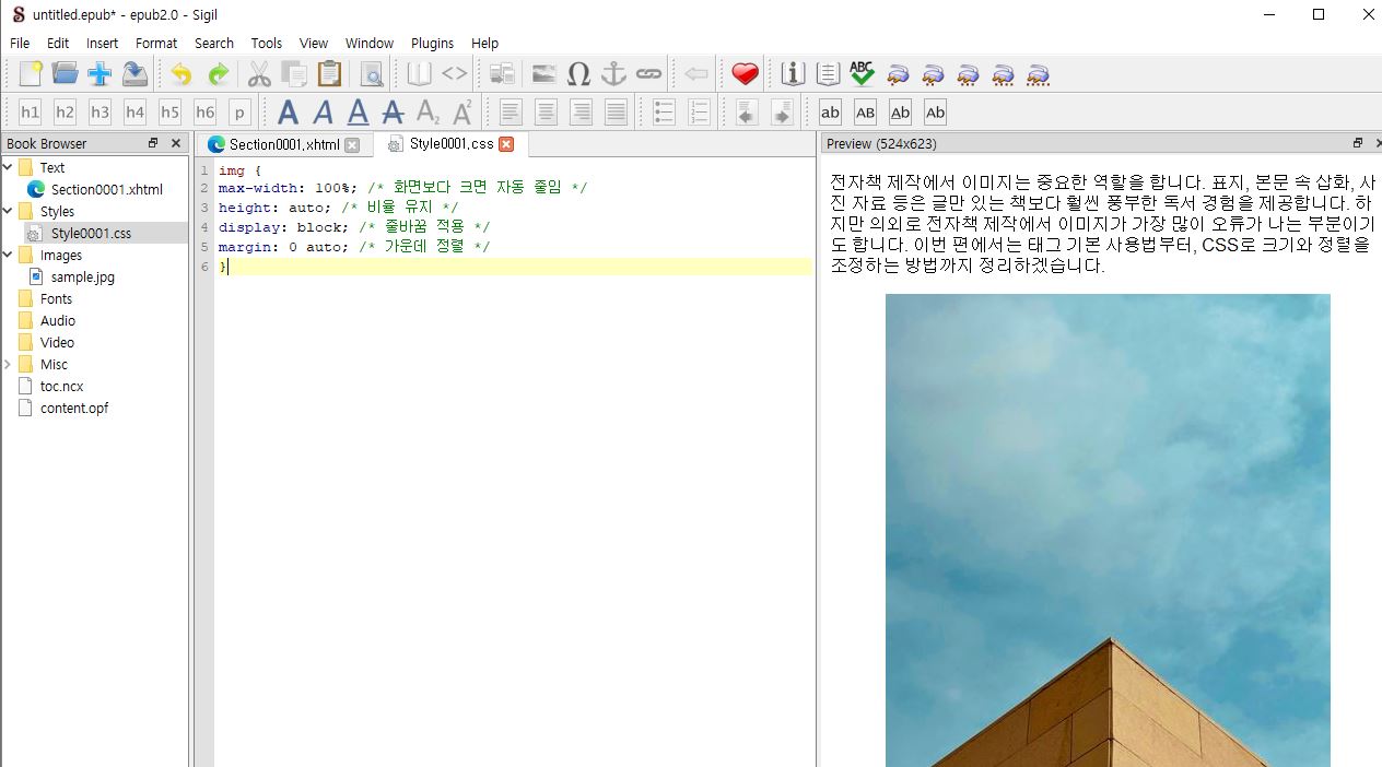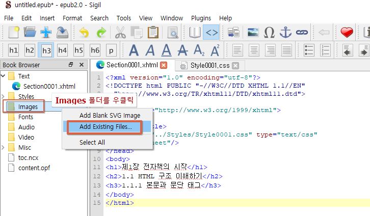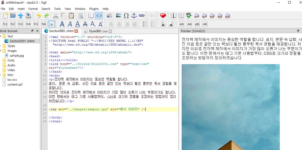 반드시 Sigil 내부의 Images 폴더에 파일을 추가해야 전자책에 포함됩니다.