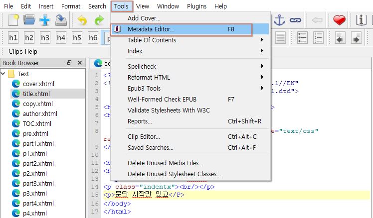 Sigil에서 [메타데이터 편집] 기능으로 책 정보를 입력할 수 있습니다.
