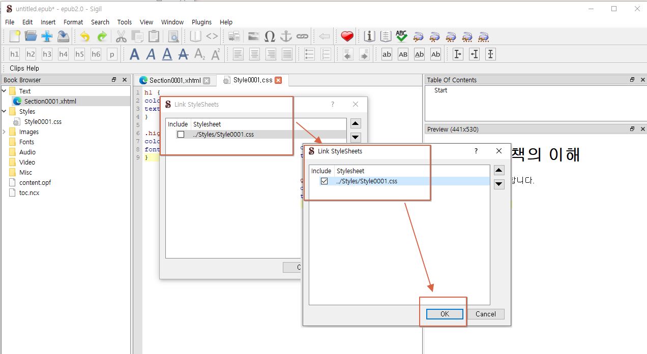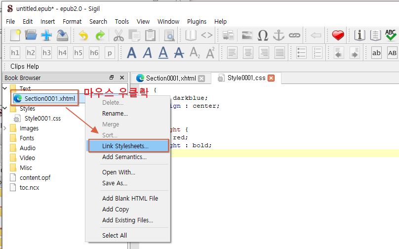 Sigil의 Book Browser에서 Text → .html (마우스 우클릭) → Link Stylesheets.... → 체크 → OK 확인 후 수정