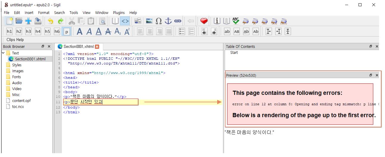 Sigil 같은 편집기를 쓰면서 작은 오타나 경로 오류 하나 때문에 전체 책이 열리지 않는 경우도 있죠.